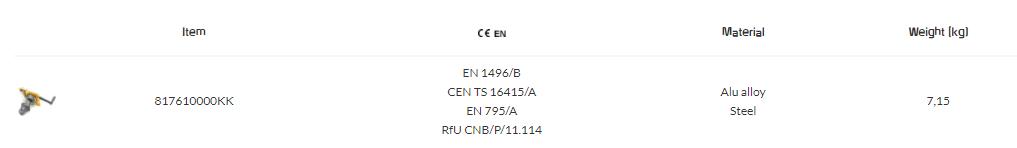 通過RfU CNB / P / 11.114標準認證(最多可6人同時使用),并根據(jù)EN 795 / A,CEN / TS 16415(限2人)和EN1496 / B進行了測試,最大重量為240公斤(在CEVEDALE BASE上安裝時為150公斤)。