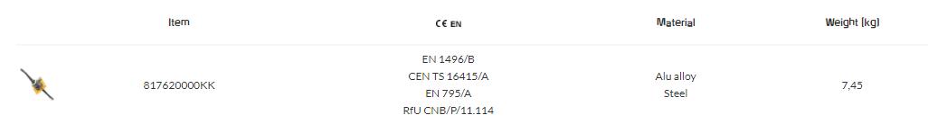通過(guò)RfU CNB / P / 11.114標(biāo)準(zhǔn)認(rèn)證(最多可同時(shí)使用6人),并根據(jù)EN 795 / A,CEN / TS 16415(最多2人)和EN1496 / B進(jìn)行了測(cè)試,最大重量為240公斤(在150公斤安裝上CEVEDALE BASE)。