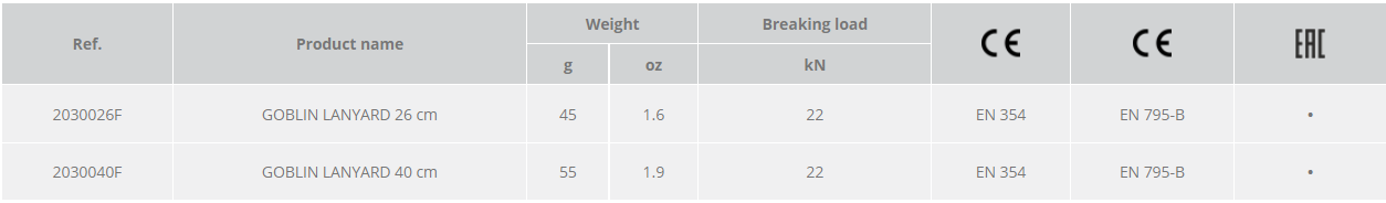 Goblin專用連接挽索,繩索抓手設(shè)計(jì),長(zhǎng)度26cm,橡膠固定片避免鎖扣旋轉(zhuǎn)及橫向受力,重量:45g,認(rèn)證標(biāo)準(zhǔn):CE EN354+EN 795/B+EAC