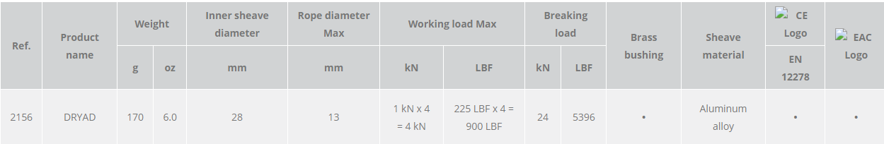 雙滑輪適合組建滑輪組,超大承重連接孔可同時(shí)連接兩把安全掛鉤,兩側(cè)可安裝抓結(jié),自動(dòng)潤(rùn)滑軸套設(shè)計(jì)適用于低速工作環(huán)境,工作效率:80%,最大過(guò)繩直徑:13mm。鋁合金材質(zhì)側(cè)板和轉(zhuǎn)輪,不銹鋼輪軸,拉力:24KN,工作負(fù)荷:1KN*4=4KN,尺寸:高102mm*寬61mm,上承重掛點(diǎn)孔徑26mm/下承重掛點(diǎn)孔徑14mm,重量:170g。認(rèn)證標(biāo)準(zhǔn):CE EN 12278+EAC