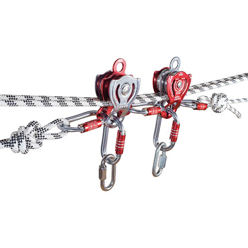 高強度可移動側板雙滑輪,超大承重連接孔可同時連接三把安全掛鉤,兩側設計有輔助連接孔及下端固定連接孔,軸承潤滑設計適用于高速工作環(huán)境,工作效率:97%,最大過繩直徑:16mm。鋁合金材質側板和轉輪,不銹鋼輪軸,拉力:42KN,工作負荷:3KN*4=12KN,尺寸:高147mm/寬100mm/上承重掛點孔徑32mm/下承重掛點孔徑19mm/兩側承擔掛點孔徑14mm,重量:425g。認證標準:CE EN12278+EAC