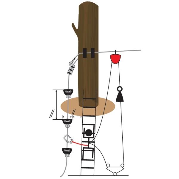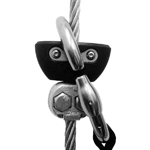 運(yùn)作原理非常簡單:掛鉤開口小于纜索的直徑,但大于分力板的厚度。這樣可以確保安全,一旦扣上救生索,在您的課程結(jié)束之前,救生索都不可能脫出。如果參于者生病、或出現(xiàn)風(fēng)暴、火災(zāi)等意外,只有使用提供給公園管理者的特殊鑰匙,才能夠解鎖套筒,然后迅速撤離。