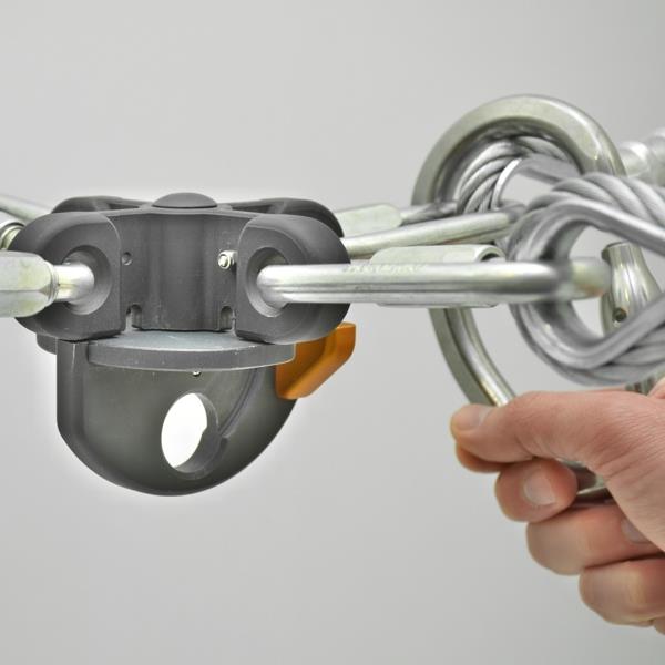 運(yùn)作原理非常簡(jiǎn)單:掛鉤開(kāi)口小于纜索的直徑,但大于分力板的厚度。這樣可以確保安全,一旦扣上救生索,在您的課程結(jié)束之前,救生索都不可能脫出。如果參于者生病、或出現(xiàn)風(fēng)暴、火災(zāi)等意外,只有使用提供給公園管理者的特殊鑰匙,才能夠解鎖套筒,然后迅速撤離。