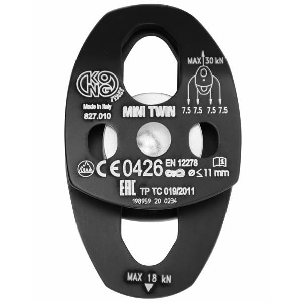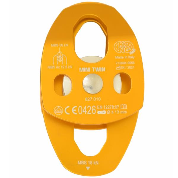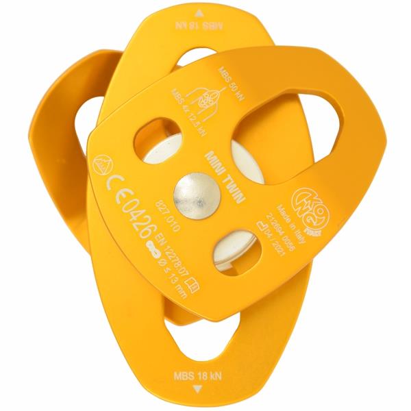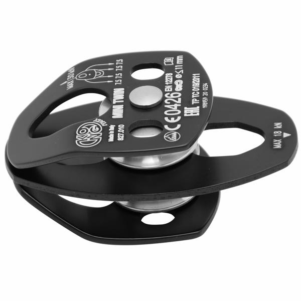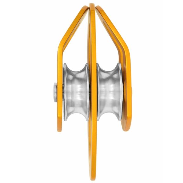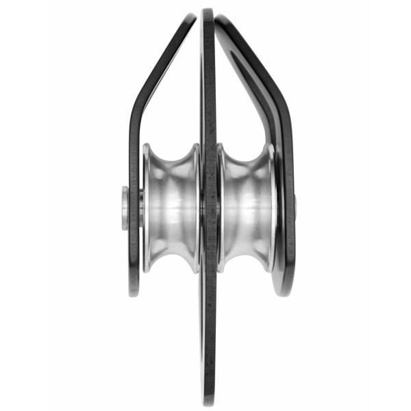 Compact aluminum pulley with double wheel, mobile side plates and high efficiency (91%) ball bearing.