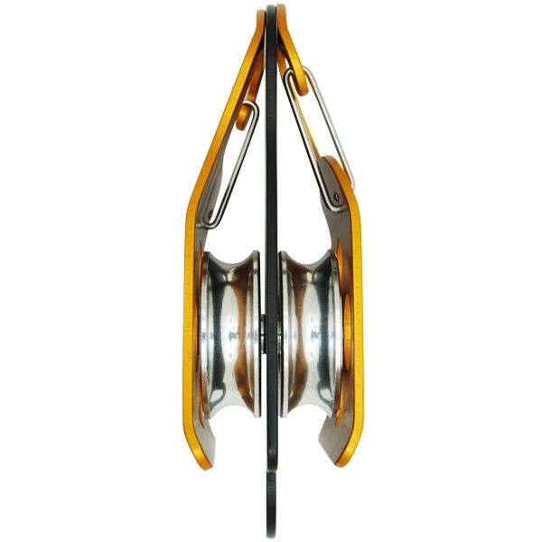 Openable double sheave aluminum pulley with high efficiency ball bearings (96%) and swinging side plates with wire gate opening.