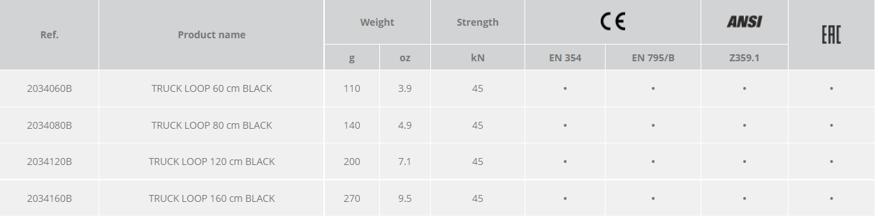 High strength anchor loops constructed from 28 mm polyamide webbing covered with a tubular webbing sheath that protects the structural webbing from abrasion or exposure to other hazards. Color coded stitching for each length of Truck Loop: 60 cm orange, 80 cm blue, 120 cm green, 160 cm red.
