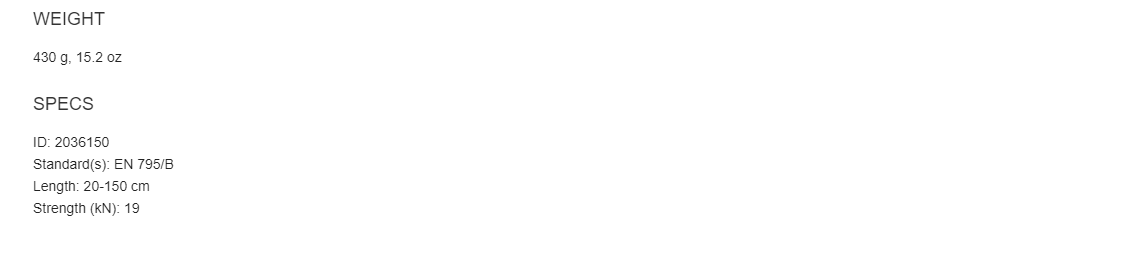 Adjustable high strength webbing anchor constructed from 45 mm polyamide webbing with fixed steel rings on the ends. Adjustable from 80 to 130 cm.