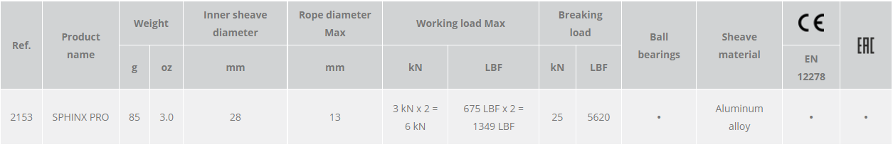 An ultra slim, highly functional fixed pulley. The main attachment point allows for full rotation of the carabiner. For use with ropes up to 13 mm. Prusik minding, the self-locking knot can be installed on one side. Sealed ball bearings for high efficiency and intensive use at high speed. Efficiency: 92%. Aluminum alloy body and wheel, stainless steel axle.