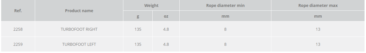 Hook these mini ascenders to your feet and climb lines with greater ease than you ever imagined! Proprietary rollers are positioned where the rope tends to rub on the body of a traditional ascender to ensure smoother action and a longer product life for both the ascender and the rope. The toothed cam is finished with a special anti-wear treatment and features drain holes to help prevent the build up of mud and grit. The innovative strap design provides a secure fit to any kind of boots or shoes and aligns the straps with the direction of the forces being applied for optimal comfort and efficiency. The proprietary rollers also allow the Turbofoot to be rigged as a locking pulley for light hauling with a max load of 50 kg, 110 lbs. (NOTE: This configuration is not intended for hauling or securing of bodies).