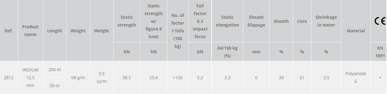 A super-strong semi-static rope for the heaviest work. Features a compact core and a 40 carrier sheath with twisted yarns to give the Iridium 12.5 mm a very high breaking strength and the ability to resist a very high number of falls.