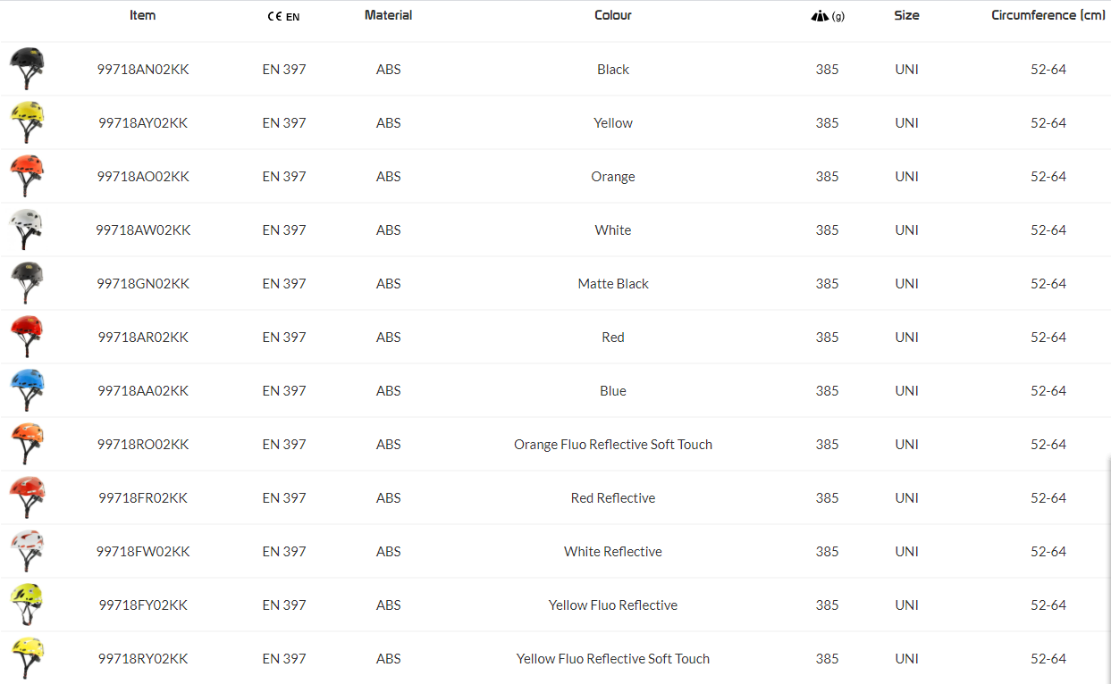 Chinstrap designed to open in the event of suspension and prevent choking: it opens between 15 and 25 daN (conform to CE EN 397 standard). Size adjustment wheel easily handable even with gloves on. Shell with ventilation holes. Clips for mounting headlamps. Pre-drilled holes for the installation of the visor and ear muffs and radio. Internal webbing suspension system with removable and washable padding.