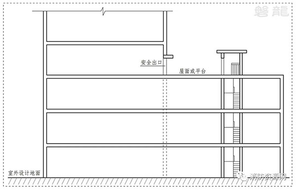 1.3 上人屋面或平臺(tái)通過(guò)滿足疏散要求的階梯等直達(dá)地面,階梯不受建筑外墻的燃燒性能和耐火極限以及建筑門窗洞口影響。(圖示5)