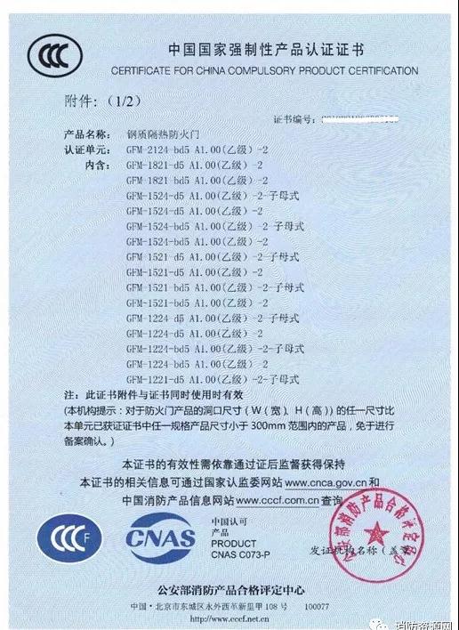 附2:子母式防火門(mén)的產(chǎn)品認(rèn)證證書(shū)樣式(注:現(xiàn)已轉(zhuǎn)為自愿性認(rèn)證):
