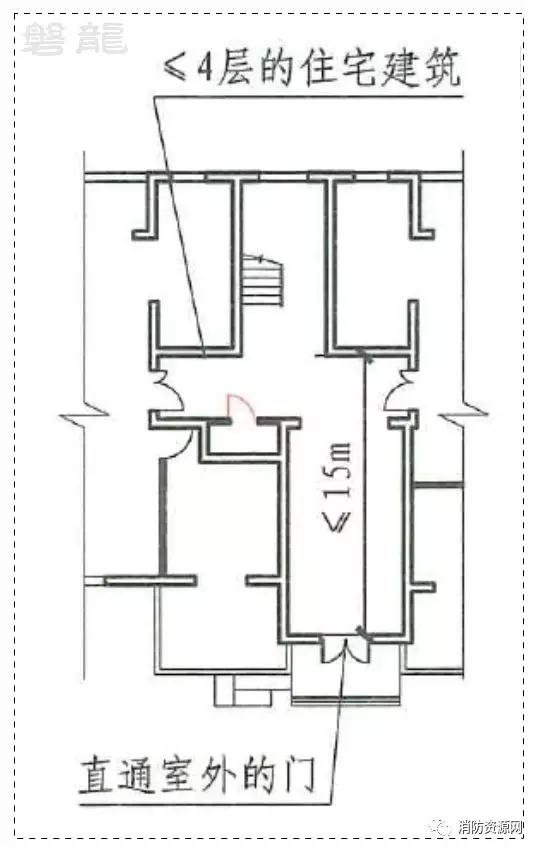 本條所述“層數(shù)不超過4層時(shí),可將直通室外的門設(shè)置在離樓梯間不大于15m處”的情況,應(yīng)僅適應(yīng)于敞開樓梯間,原因如下:1、“公津建字【2015】27號(hào)”文件明確了“樓梯間應(yīng)在首層直通室外,確有困難時(shí),可在首層采用擴(kuò)大的封閉樓梯間或防煙樓梯間前室”。依此文要求,當(dāng)樓梯間不能在首層直通室外時(shí),封閉樓梯間或防煙樓梯間均應(yīng)采用擴(kuò)大的封閉樓梯間或防煙樓梯間前室的方式直通室外。2、規(guī)范圖示也清晰表述了是適于敞開樓梯間的形式: