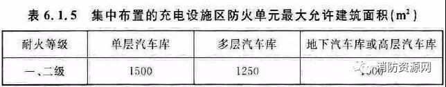 根據(jù)《電動汽車分散充電設(shè)施工程技術(shù)標準》(GB/T51313-2018)要求,新建汽車庫內(nèi)配建的分散充電設(shè)施在同一防火分區(qū)內(nèi)應(yīng)集中布置,應(yīng)設(shè)置獨立的防火單元,每個防火單元的最大允許建筑面積應(yīng)符合表6.1.5的規(guī)定。