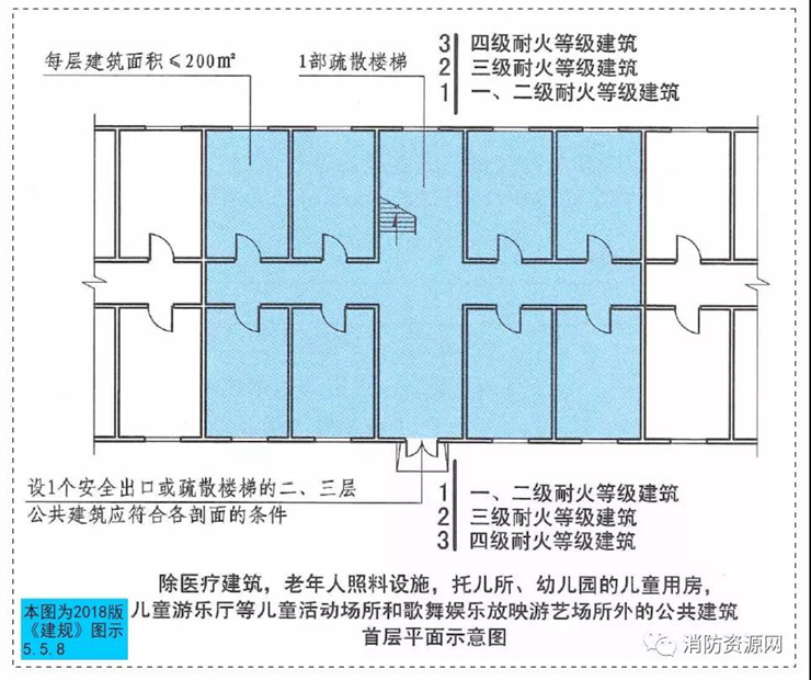 實際應(yīng)用中,宜以單座建筑為單位,不應(yīng)突破每層最大建筑面積不大于200m2的要求。一、對于只設(shè)置一個安全出口或1部疏散樓梯的情況,規(guī)范條文5.5.8是以單座建筑為單位:根據(jù)《建筑設(shè)計防火規(guī)范》5.5.8要求:除醫(yī)療建筑,老年人照料設(shè)施,托兒所、幼兒園的兒童用房,兒童游樂廳等兒童活動場所和歌舞娛樂放映游藝場所等外,符合表 5.5.8 規(guī)定的公共建筑,可以只設(shè)置1個安全出口或1部疏散樓梯:
