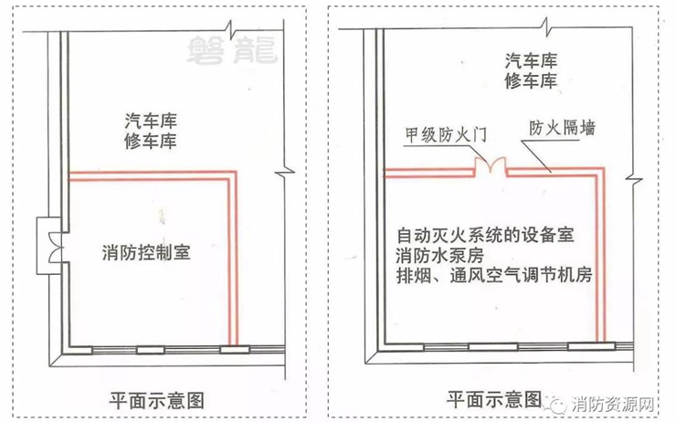 1、屬于民用建筑的地下或半地下設(shè)備用房,或主要用于民用建筑的設(shè)備用房,應(yīng)執(zhí)行《建筑設(shè)計(jì)防火規(guī)范》,設(shè)備用房的防火分區(qū)最大允許建筑面積不應(yīng)大于1000㎡(設(shè)置自動滅火系統(tǒng)時(shí)不大于2000㎡)。2、地下汽車庫適應(yīng)《汽車庫、修車庫、停車場設(shè)計(jì)防火規(guī)范》,防火分區(qū)最大允許建筑面積不應(yīng)大于2000㎡(設(shè)置自動滅火系統(tǒng)時(shí)不大于4000㎡)。由上可知,地下汽車庫的防火分區(qū)面積較民用建筑的地下設(shè)備用房整整大了一倍,如交叉設(shè)置必然造成混亂,因此民用建筑的設(shè)備用房不應(yīng)劃入汽車庫防火分區(qū)。注:對于僅供汽車庫使用或主要供汽車庫使用的附屬設(shè)備用房,可以和汽車庫劃為同一防火分區(qū)。二、民用建筑的設(shè)備用房,不應(yīng)向汽車庫開設(shè)疏散門或安全出口。1、汽車庫的安全疏散距離相對寬松:“汽車庫室內(nèi)任一點(diǎn)至最近人員安全出口的疏散距離不應(yīng)大于45m,當(dāng)設(shè)置自動滅火系統(tǒng)時(shí),其距離不應(yīng)大于60m(6.0.6)”,汽車庫的安全疏散和民用建筑部分不應(yīng)混雜。2、汽車庫規(guī)范已明確“防火墻上通向相鄰防火分區(qū)的甲級防火門,不得作為第二安全出口(6.0.2)”,也就是說“汽車庫的防火分區(qū)不得借用相鄰防火分區(qū)的安全出口”。綜上,既然汽車庫自屬的防火分區(qū)之間都不能借用安全出口,當(dāng)然更不會允許民用建筑用房向汽車庫開設(shè)疏散門或借用安全出口。依此,民用建筑的設(shè)備用房,不應(yīng)向汽車庫開設(shè)疏散門或安全出口。三、附設(shè)在汽車庫、修車庫內(nèi),且主要為其服務(wù)的消防控制室、自動滅火系統(tǒng)的設(shè)備室、消防水泵房和排煙、通風(fēng)空氣調(diào)節(jié)機(jī)房等,應(yīng)采用防火隔墻和耐火極限不低于1.50h的不燃性樓板相互隔開或與相鄰部位分隔,部分設(shè)備室的疏散門可以向汽車庫或修車庫開啟,詳見圖示1。