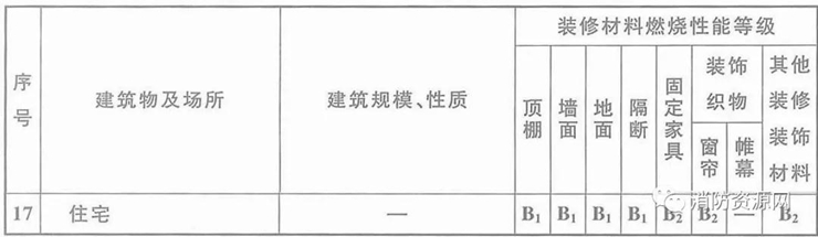 二、單層、多層住宅建筑內(nèi)部各部位裝修材料的燃燒性能等級(jí),不應(yīng)低于下表規(guī)定。(5.1.1)