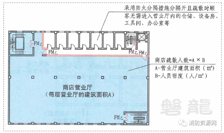 注1:本條所指“營業(yè)廳的建筑面積”,既包括營業(yè)廳內(nèi)展示貨架、柜臺、走道等顧客參與購物的場所,也包括營業(yè)廳內(nèi)的衛(wèi)生間、樓梯間、自動扶梯等的建筑面積。對于進(jìn)行了嚴(yán)格的防火分隔,并且疏散時(shí)無需進(jìn)入營業(yè)廳內(nèi)的倉儲、設(shè)備房、工具間、辦公室等,可不計(jì)入營業(yè)廳的建筑面積。