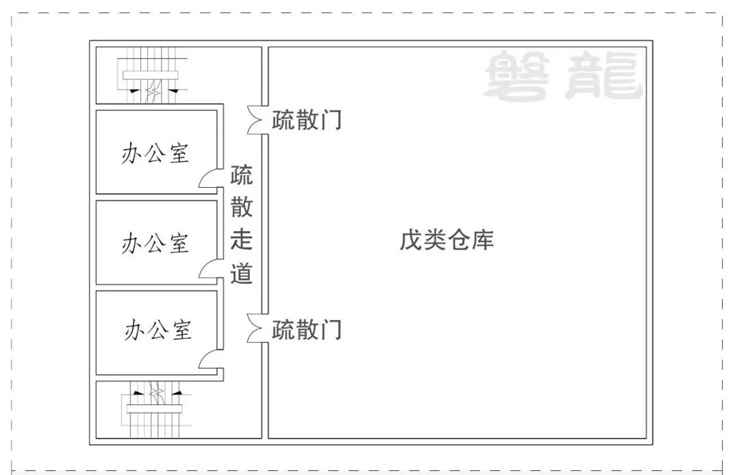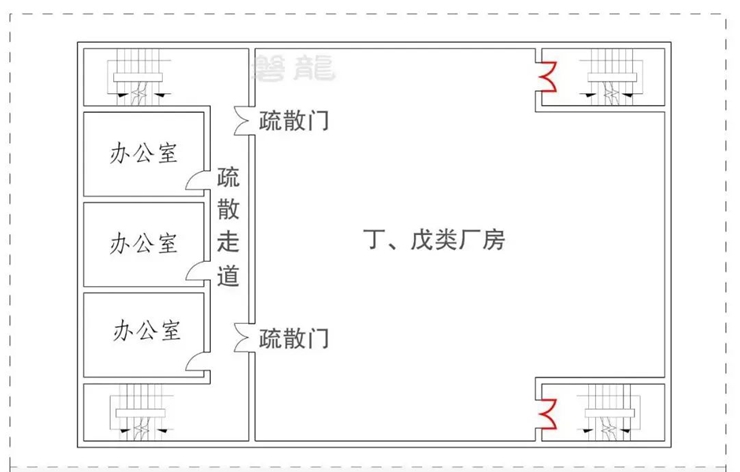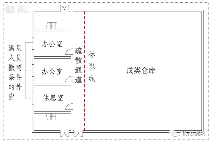 雖然規(guī)范未要求丁戊類廠房和戊類倉庫的辦公休息室采用防火隔墻分隔,但考慮辦公休息室的不同建筑類別,以及生產(chǎn)儲存區(qū)域的實際風險,因此仍有必要作為相對獨立的區(qū)域,可采用普通隔墻(房間隔墻或疏散走道隔墻)與生產(chǎn)儲存區(qū)域分隔。